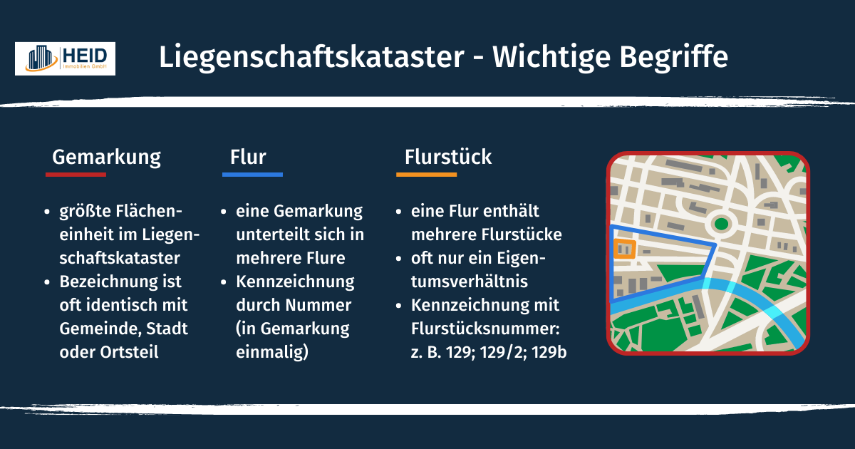 Die Grundlage des Katasters bildet die Gemarkung, ein geografischer Bezirk, der aus mehreren Fluren besteht. Fluren wiederum sind Teilbereiche einer Gemarkung, die durch natürliche oder künstliche Grenzen voneinander abgegrenzt sind.